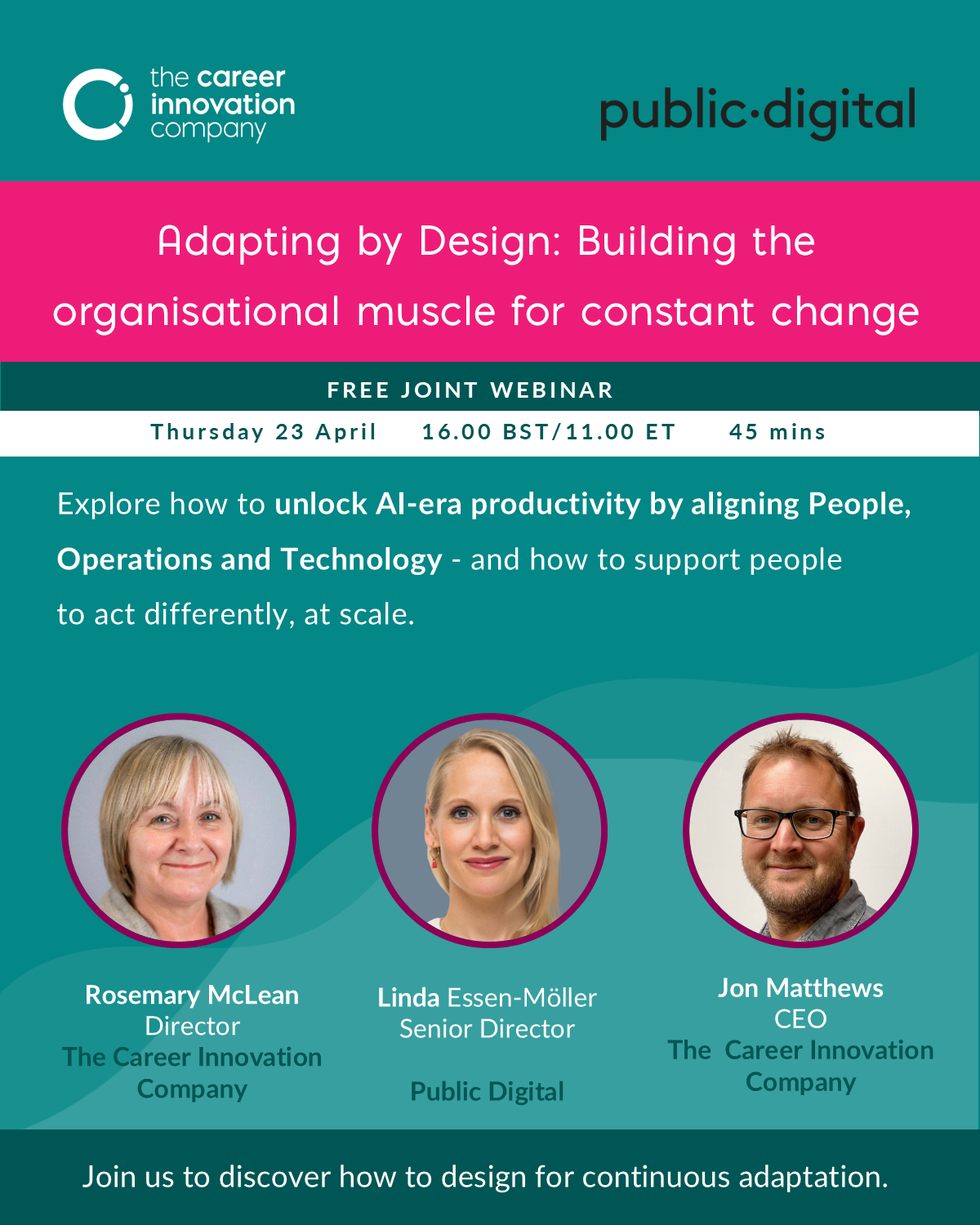 In this joint session, The Career Innovation Company and Public Digital will explore how organisations can design for continuous adaptation – aligning operating models with workforce capability.